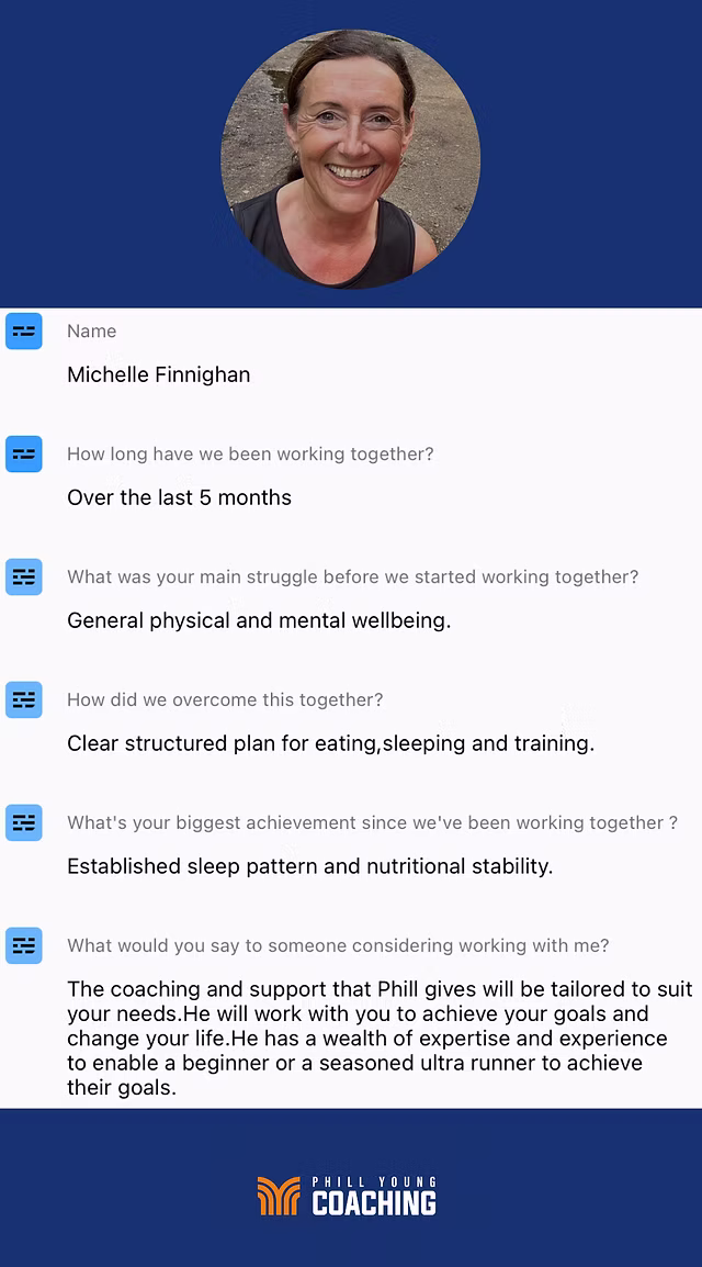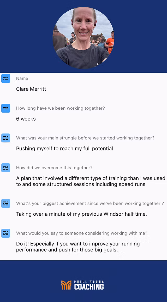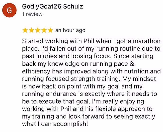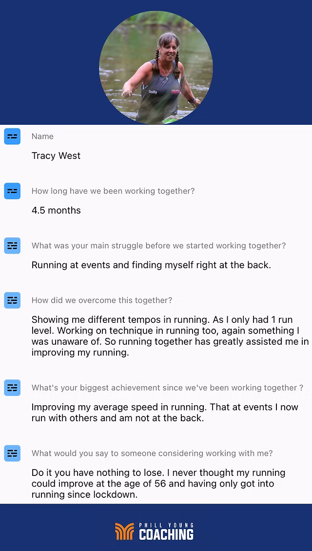 Phill's empathetic, flexible & realistic approach to my training makes it easier for me to be a better runner, by providing the structure, accountability and support that works for me.